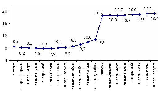 В среднегодовом выражении уровень инфляции в январе-августе 2008 года к соответствующему периоду прошлого года составил 19,4%.