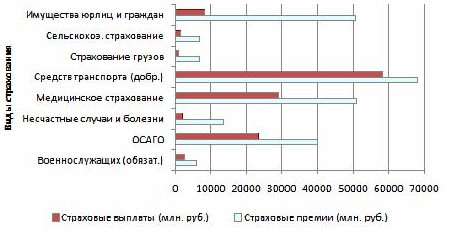 Рис.2. Российский страховой рынок – соотношение премий и выплат по отдельным видам страхования за 2010 год.
