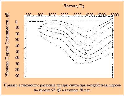 В таблице приведен пример возможного развития потери слуха в течение 30 лет. Предполагается, что человек в этом случае подвергался воздействию шумов на уровне 95 дБ. Приведенные графики показывают процесс изменения Порога Слышимости звуков разных диапазонов частот. Графики показывают, что шум воздействует, прежде всего, на возможность восприятия звуков на более высоких частотах. Затем изменяется Порог Слышимости на частотах 1000 Гц и 500 Гц. В этом примере, человек поначалу не ощутит каких-либо изменений. Но при развитии потери слуха до 10-ти летнего уровня, человек начнет чувствовать, что ему тяжело воспринимать разговор на вечеринках, в ресторанах, везде, где присутствует фоновый шум.