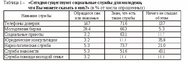 Результаты исследования показали, что молодые люди знают о существовании таких социальных служб как наркологическая (73,7%), телефон доверия (71,6%), молодежная биржа труда (66,3%), социальные приюты (63,1%), юридическая консультация (61,0%) (см. таблицу 1).