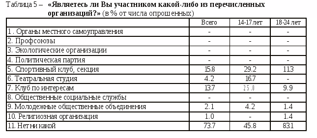 Несмотря на довольно высокий процент тех, кто не участвует ни в каких объединениях и движениях (73,7%), в целом 14-17 летние «выглядят» более «инициативными». По многим параметрам участия они «обходят» среднюю возрастную группу (18-24 года): 29,2% занимается в спортивных клубах, каждый четвертый участвует в работе клубов по интересам, несколько меньше – в театральной студии (16,7%). Заслуживает, на наш взгляд, внимания и такой факт. Больше половины 18-24 летних располагает сведениями о существовании молодежных объединений в городе, но только 1,4% является их участниками: соотношение выглядит 50:1, то есть из каждых пятидесяти «знающих» молодых людей один является участником молодежного общественного объединения. В группе 14-17 летних это соотношение составило 3:1, то есть из каждых трех «знающих» один участвует в каком-либо молодежном объединении (см. таблицу 5).