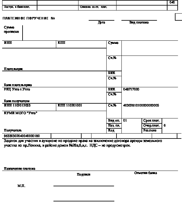 Получатель: КУМИ МОГО "Ухта", счет: 40302810100000000005 в РКЦ Ухта г.Ухта, ИНН 1102012053, КПП 110201001, БИК 048717000. Коды получателя: КБК 96330302040040000180, ОКАТО 87425000000. Указать назначение платежа: "Задаток для участия в аукционе по продаже права на заключение договора аренды земельного участка по пр.Ленина, в районе домов №28а,б,в,г".