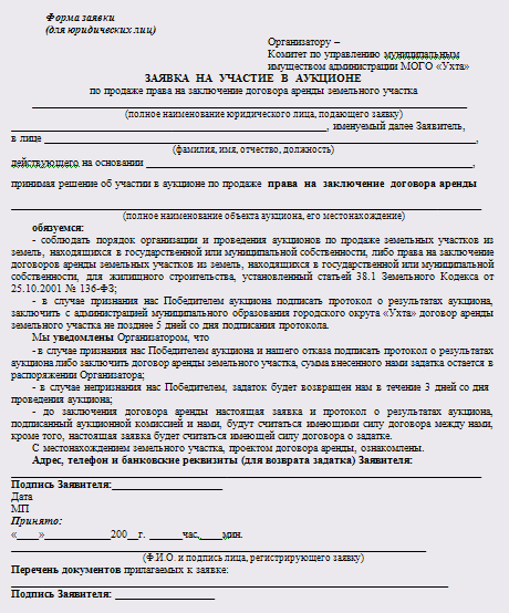– заявку установленной формы в двух экземплярах (форма заявки указана ниже) с указанием реквизитов счета для возврата задатков;