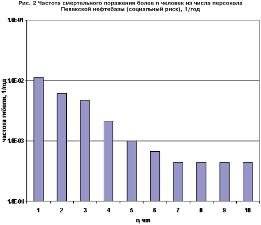 Полученные значения частоты поражения персонала (1/год) (рис. 2) показывают, что наиболее крупная авария для персонала с гибелью не менее 10 человек имеет вероятность 4,4 ×10-4 год-1.