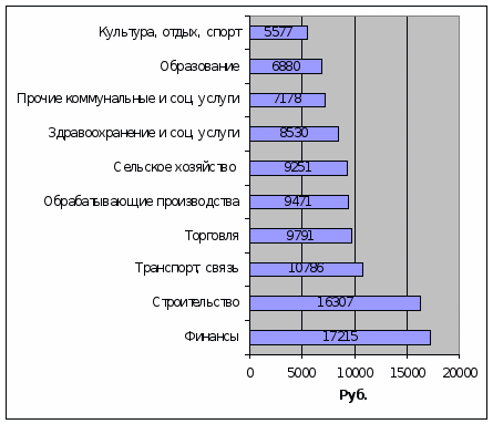 Таким образом, в 2007 году средняя номинальная заработная плата в районе увеличилась на 30% по сравнению с 2006 годом. Средняя номинальная заработная плата, начисленная за 2008 год, составила 9968 рублей и увеличилась по сравнению с 2007 годом на 27,3%. Показатели заработной платы в районе по отраслям экономики в 2008 году представлены на рисунке 5.