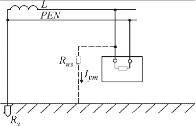 РИС.2. Расчетная схема определения мощности, выделяемой на сопротивлении изоляции: L - линия; PEN - совмещенный нулевой защитный и нулевой рабочий проводники