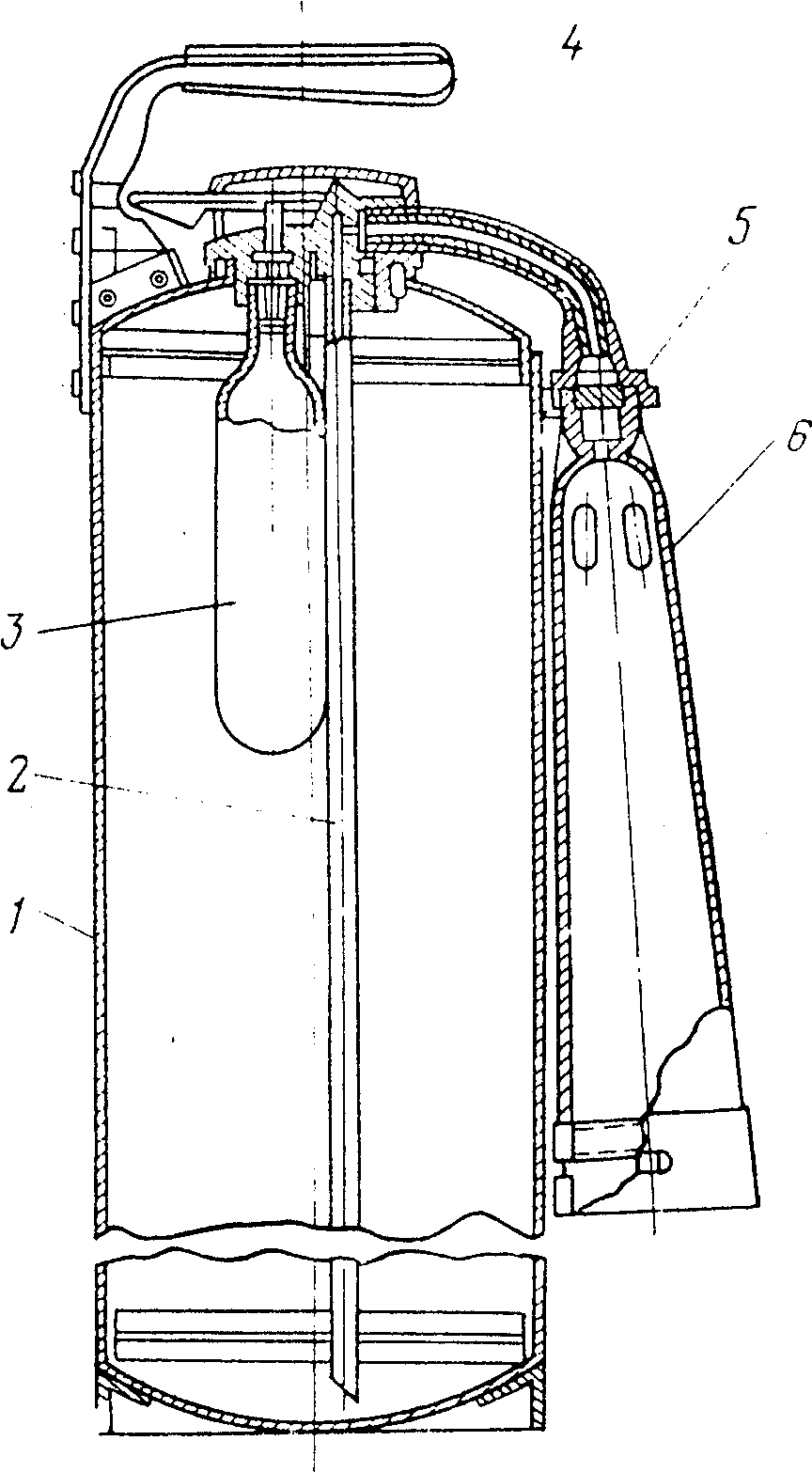 1 - корпус; 2 - сифонная трубка; 3 - баллон; 4 - рукоятка; 5 - распылитель; 6 - раструб с сеткой.