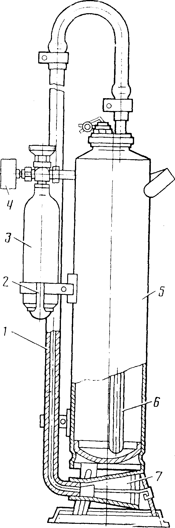 1- удлинитель; 2- кронштейн; 3-баллон с рабочим газом; 4- манометр; 5- корпус; 6- сифонная трубка; 7- насадок.