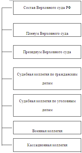 Завершающее звено в структуре судов обшей юрисдикции — Верховный Суд РФ. Будучи высшим судебным органом по гражданским, уголовным и административным делам, выполняя особые задачи, Верховный Суд имеет систему структурных подразделений: Пленум; Президиум; Судебную коллегию по гражданским делам; судебную коллегию по уголовным делам; военную коллегию. Судебные коллегии утверждаются Пленумом Верховного Суда из числа его судей. Распределение судей по коллегиям производит Пленум по представлению председателя Суда. Руководят работой коллегий их председатели, которые являются заместителями председателя Верховного Суда РФ.
