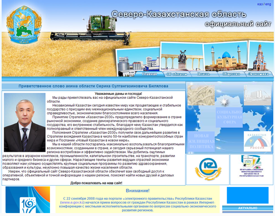На сегодняшний день в Северо-Казахстанской области все государственные учреждения имеют собственные веб-сайты. Головным является официальный сайт Северо-Казахстанской области www.sko.kz рис.2