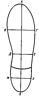 АБ - довжина сліду; ВГ - ширина підметкової частини сліду; ДЕ - ширина проміжної частини сліду; ЖЗ - ширина каблучної частини сліду.