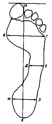 АБ - довжина сліду; ВГ - ширина плюсневої частини сліду; ДЕ - ширина проміжної частини сліду; ЖЗ - ширина пяточної частини сліду
