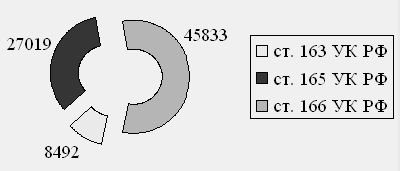 Рисунок 5 Количественный состав преступлений, предусмотренных ст.ст. 163, 165, 166 УК РФ, зарегистрированных в России в течение 2009 года