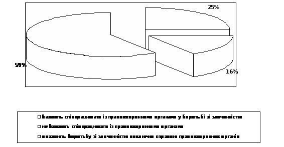 Вважаємо таким стан справ, встановлений нашим дослідженням, вкрай незадовільним, коли переважна більшість відсторонюється від діяльності щодо підтримання правопорядку та попередження злочинності, значна частина абсолютно не бажає цим займатись. І тільки одна четверта респондентів погоджується на співпрацю із правоохоронними органами.