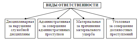 В зависимости от вида и серьезности правонарушения, степени вины и обстоятельств, при которых служебные обязанности были нарушены, к муниципальным служащим могут применяться следующие виды юридической ответственности: уголовная; административная; дисциплинарная; гражданско-правовая;