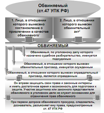 Обвиняемый — один из центральных участников уголовного процесса: по поводу вменяемых ему деяний проводится предварительное расследование и судебное разбирательство, постановляется приговор.
