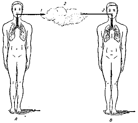А - зараженный организм; Б - здоровый организм; 1 - акт выведения возбудителя (выдох); 2 - пребывание возбудителя вне организма; 3 - акт введения возбудителя (вдох).