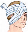 Наложение повязки на рану волосистой части головы осуществляют следующим образом: от бинта оторвать кусок (завязку) размером около 1 м, положить его на область темени, концы опускают вертикально вниз спереди от ушей; сам больной или кто-нибудь из помощников удерживает их в натянутом состоянии. Тур бинта начинают с левой стороны на уровне лба, переходят на правую сторону назад на затылок, таким образом делают два тура с обязательной фиксацией первого тура. Третий тур бинта оборачивают вокруг завязки то слева, то справа, так что бы он на 1/2 или 2/3 перекрывал предыдущий тур бинта. Каждый последующий тур ведут все выше и выше, пока вся волосистая часть головы не будет забинтована. Последний тур бинта привязывают к оставшейся вертикальной части завязки с любой стороны. Вертикальные концы завязки закрепляют под подбородком.