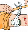 Для остановки кровотечения, уменьшения припухлости (отека) и создания покоя (например, поврежденной конечности) на область раны накладывают давящую повязку (желательно стерильную) из бинта, чистой проглаженной несинтетической материи.