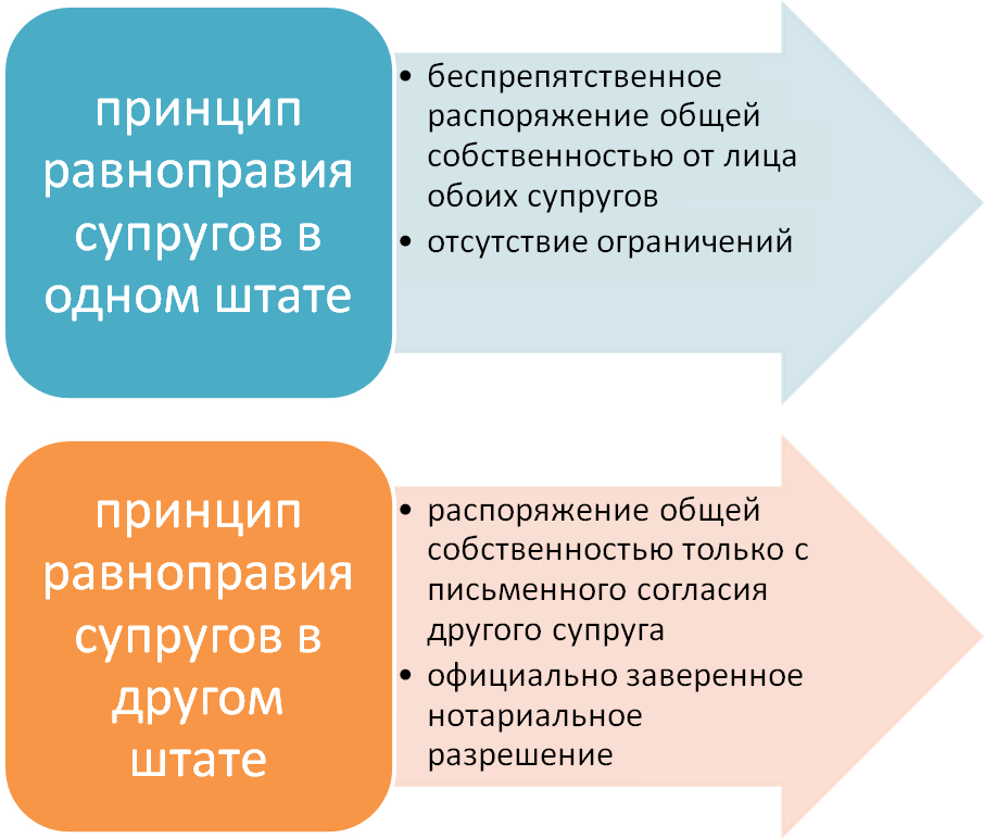 Вторая модель имеет отношение к общему имуществу супругов, приобретенному за время их совместного проживания, а также ко всем доходам, полученным каждым из них по трудовому контракту, в результате осуществления индивидуальной деятельности или в соответствии с программами социальной помощи. Имущество, имеющее общий статус, управляется с соблюдением принципов равноправия супругов и имеет несущественные различия в некоторых штатах. Например, в одном штате любой супруг имеет право беспрепятственно распоряжаться любой общей собственностью от лица обоих супругов, причём в отсутствие каких-либо ограничений. А в другом штате подобная практика по распоряжению общим имуществом супругов возможна лишь только при получении письменного согласия другого, а иногда даже обоих супругов. При этом в отдельных случаях необходимо предоставить официальную заверенную в нотариате копию подобного согласия судебным органам или органам ЗАГС [приложение 3].