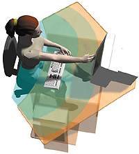 «А на чем же лучше всего сочетать длительные компьютерные и письменные работы?» — возникает естественный вопрос. Ответ на него таков: в основном пригодность и функциональность любого стола определяет его рабочая зона. Та часть столешницы, до которой работающий человек дотягивается рукой с прижатым к туловищу локтем, считается ближней зоной охвата, а то место, куда он может дотянуться, полностью выпрямив руку, — границей дальней зоны.