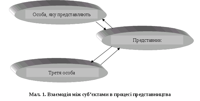 У відносинах представництва беруть участь три суб'єкти: особа, яку представляють, представник і третя особа(Мал. 1).