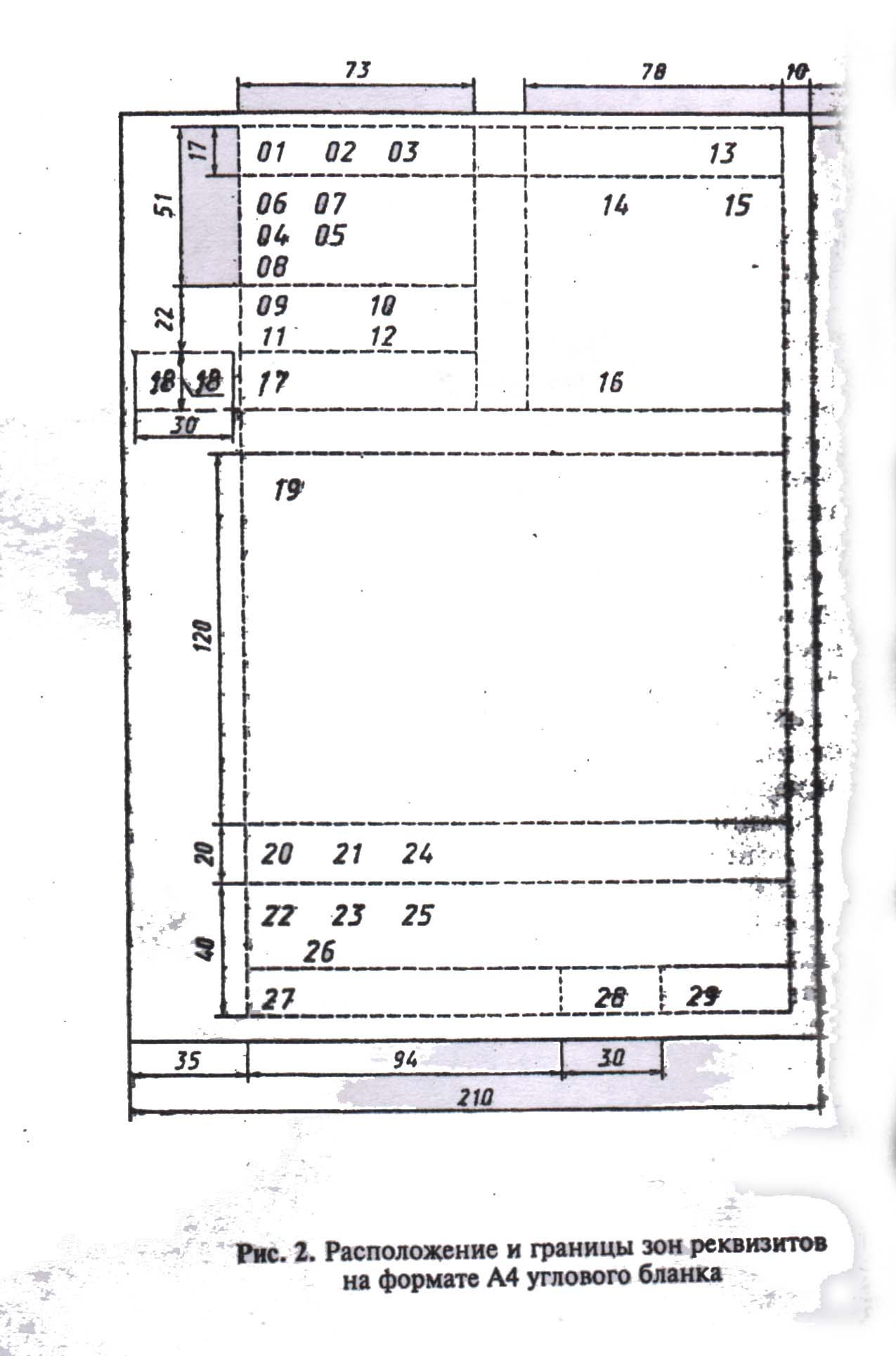 Бланки конструируются на основе как углового, так и продольного расположения реквизитов. Бланки с угловым расположением реквизитов выгоднее, поскольку позволяет экономить до 20% площади места бумаги. Формуляр, приведенный на рис. 2, предусматривает именно такое расположение.