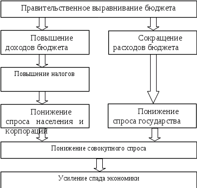 Для иллюстрации предположим, что экономика столкнулась с затяжной безработицей и падением доходов. Как явствует из рис. 1, в подобных обстоятельствах налоговые поступления автоматически сокращаются. Для принятия сбалансированного бюджета правительство должно либо повысить ставки налогов, либо сократить государственные расходы, либо сделать и то и другое. Все эти меры носят ограничительный, сдерживающий характер; каждая из них еще сильнее подавляет, а вовсе не стимулирует совокупный спрос.