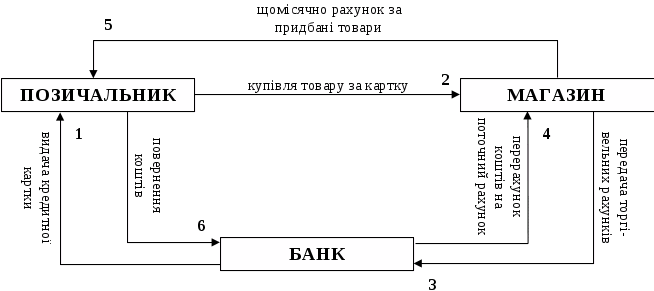 Кредитні картки пердбачають участь трьох сторін: банка-емітента кредитної картки, її власника і торгівельної організації, яка приймає кредитні картки в якості платіжного засобу за товари та послуги. Для отримання кредитної картки клієнт повинен надати банку встановлену банком суму грошових коштів. Оплата товарів та послуг може бути проведена і при відсутності грошових коштів на рахунку клієнта, тобто за рахунок банківського кредиту. Банк за свої послуги отримує відсоток від суми кожної операції. Користувачі кредитної картки також повинні перераховувати визначену суму коштів за обслуговування картки та її щорічне поновлення.