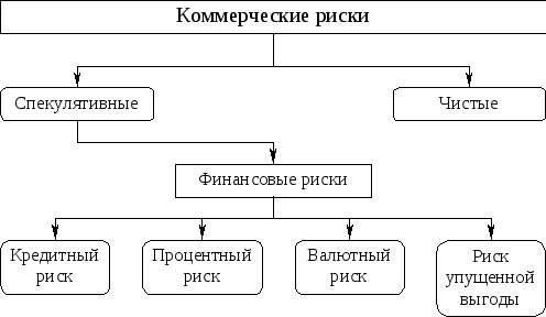 Финансовые риски – это коммерческие риски. Риски бывают чистые и спекулятивные. Чистые риски означают возможность получения убытка или нулевого результата. Спекулятивные риски выражаются в возможности получения как положительного, так и отрицательного результата. Финансовые риски – это спекулятивные риски. Инвестор, осуществляя венчурное вложение капитала, заранее знает, что для него возможны только два вида результатов: доход или убыток. Особенностью финансового риска является вероятность наступления ущерба в результате проведения каких-либо операций в финансово-кредитной и биржевой сферах, совершения операций с фондовыми ценными бумагами, т.е. риска, который вытекает из природы этих операций. К финансовым рискам относятся кредитный риск, процентный риск, валютный риск; риск упущенной финансовой выгоды (рисунок 1).