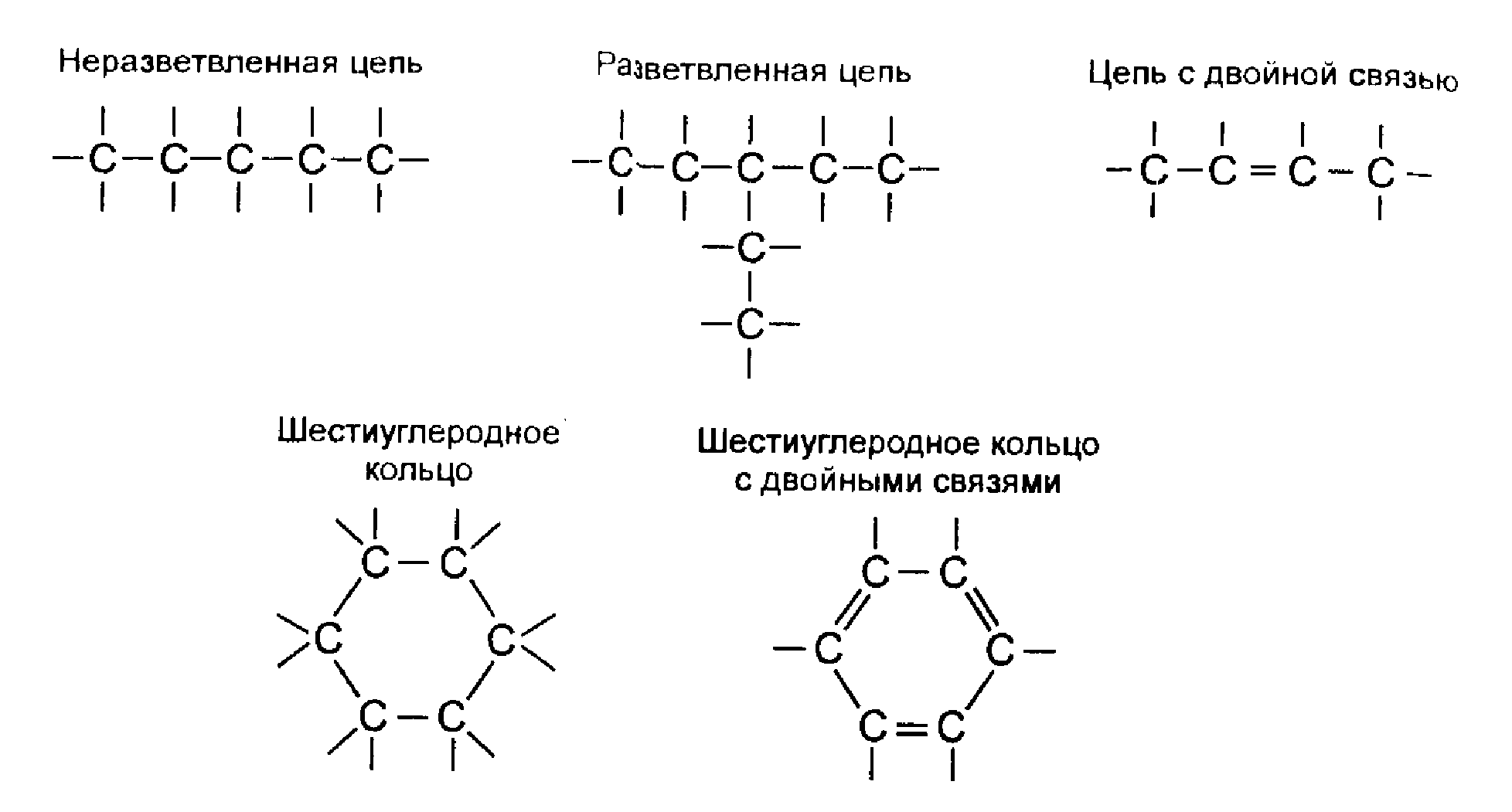 Рис. 1. Способы соединения атомов углерода друг с другом Черточки со свободными концами при каждом атоме углерода показывают, что он может образовывать связи с атомами других элементов (обычно это водород, кислород, азот, сера)