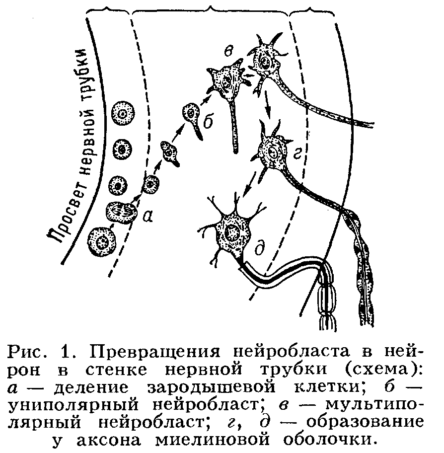Как спинной, так и головной мозг позвоночных покрыт рядом оболочек и заключён в костные покровы — череп и позвоночник. В процессе эволюции происходит дальнейшее усложнение структуры нервной системы и усовершенствование всех форм её взаимодействия с внешней средой; при этом всё большее значение приобретают прогрессирующие в своём развитии передние отделы головного мозга. У рыб передний мозг почти не дифференцирован, но у них хорошо развиты задний, а также средний мозг; наибольшего развития у рыб достигает мозжечок. У земноводных и пресмыкающихся задний мозг занимает относительно меньший объём, чем у рыб, мозжечок же уступает в развитии среднему мозгу, который делится на 2 части, образуя двухолмие. Усложняется структурно и функционально передний мозговой пузырь, он дифференцируется на промежуточный мозг и 2 полушария с развитой нервной тканью, образующей т. н. первичную кору мозга. Передний мозг, первоначально связанный лишь с обонянием, затем приобретает и более сложные функции. Несколько обособленное место в эволюционном ряду занимают птицы, у которых доминируют структуры т. н. мозгового ствола, т. е. средний мозг и только те части переднего мозга, которые расположены в глубине полушарий (базальные ганглии, промежуточный мозг); сильно развит у птиц и мозжечок; кора головного мозга дифференцирована слабо. Высшего развития нервная система достигает у млекопитающих. Головной конец нервной трубки в эмбриогенезе делится у них на 5 пузырей: передний — даёт начало большим полушариям и промежуточному мозгу, средний — среднему мозгу, задний — делится на собственно задний (варолиев мост и мозжечок) и продолговатый мозг. Кора больших полушарий головного мозга образует многочисленные борозды и извилины. Первичная полость нервной трубки превращается в желудочки мозга и спинномозговой канал. Нейронная организация мозга крайне усложняется. Развитие и дифференциация структур нервной системы у высокоорганизованных животных обусловили её разделение на соматическую и вегетативную нервную систему. Особенность строения вегетативной нервной системы та, что её волокна, отходящие от ЦНС, не доходят непосредственно до эф-фектора, а сначала вступают в периферич. ганглии, где оканчиваются на клетках, отдающих аксоны уже непосредственно на иннервируемый орган. В зависимости от того, где расположены ганглии вегетативной нервной системы и некоторых её функциональных особенностей вегетативную нервную систему делят на 2 части: парасимпатическую и симпатическую. Кроме нервных клеток, в структуру нервной системы входят глиальные клетки. Нейроны являются в известной мере самостоятельными, единицами — их протоплазма не переходит из одного нейрона в другой. Взаимодействие между нейронами осуществляется благодаря контактам между ними. В области контакта между окончанием одного нейрона и поверхностью другого в большинстве случаев сохраняется особое пространство — синап-тич. щель — шириной в несколько сот аксон. Основные функции нейронов: восприятие раздражении, их переработка, передача этой информации и формирование ответной реакции. В зависимости от типа и хода нервных отростков (волокон), а также их функций нейроны подразделяют на: а) рецепторные (афферентные), волокна которых проводят нервные импульсы от рецепторов в ЦНС; тела их на