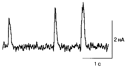 Свойства нервно-мышечных синапсов диктовали и методы регистрации. Одиночный акт передачи сигнала через синапс длится всего несколько тысячных долей секунды (миллисекунд), поэтому для его регистрации возможны только электрические измерения. С этой целью изолированный препарат помещают в ванночку с солевым раствором, с той же концентрацией ионов, как в плазме крови лягушки. Нерв укладывают на раздражающие электроды, а в мышечное волокно, в непосредственной близости с синапсом, вводят внутриклеточные микроэлектроды. Последние представляют собой тонкие стеклянные трубки, диаметр вытянутого кончика которых не превышает одного-двух микрометров. Микроэлектрод, заполненный концентрированным раствором хлористого калия, может служить для измерения разности потенциалов между внутренностью мышечного волокна и его поверхностью. Специальная система усилителей биоэлектрических сигналов позволяет одновременно регистрировать и быстрые изменения электрического тока, вызванные действием медиатора, и удерживать потенциал на мембране мышечного волокна на заданном уровне. Электрические синаптические ответы затем можно вывести на экран осциллографа (рис.4), записать на магнитную ленту либо после преобразования в цифровую форму проанализировать на компьютере. Такая система позволяет экспериментатору оценивать изменения синаптической передачи в ходе опыта.