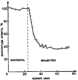 Эксперимент на мышце лягушки, демонстрирующей угнетения освобождения ацетилхолина из двигательных нервных окончаний в результате действия одного из его аналогов на пресинаптические рецепторы. Видно, что постсинаптические токи, вызванные периодическим раздражением нерва, при действии вещества значительно уменьшают свою амплитуду по сравнению с контрольным периодом