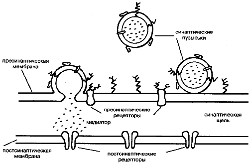 Схема синапса. Вверху - участок нервного окончания, ограниченный пресинаптической мембраной, в которую встроены пресинаптические рецепторы; синаптические пузырьки внутри нервного окончания наполнены медиатором и находятся в разной степени готовности к его освобождению; мембраны пузырьков и пресинаптическая мембрана содержат пресинаптические белки. Внизу - участок управляемой клетки, в постсинаптическую мембрану которой встроены постсинаптические рецепторы