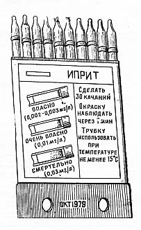 ИНДИКАТОРНЫЕ ТРУБКИ, имеющие одинаковую маркировку, укладываются в кассеты по 10 штук. На лицевой стороне кассеты наклеена этикетка с изображением окраски. возникающей на наполнителе трубки при наличии в воздухе ОВ, и указан порядок работы с данной трубкой. В комплект прибора ВПХР входят три комплекта индикаторных трубок.