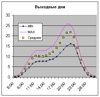 Рис. 3 - Кривая минимальных, средних и максимальных значений времени просмотра (минут/час) (2002-2003 гг.), выходные дни