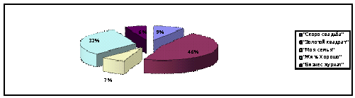 Наибольшей популярностью среди журналов у клиентов Калужского отделения Сбербанка России пользуется «Золотой квадрат»-47%(66 чел), размещение рекламы в нем имеет наибольший процент вероятности донесения информации до целевой аудитории, чем в других изданиях.