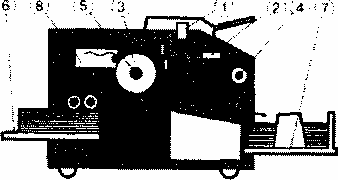 Рисунок 5 – Принципова схема різографа: 1 – вбудований сканер оригіналів, 2 – термоголовка для виготовлення трафаретної форми, 3– формонесучий циліндр, 4– рулон із формною основою (майстер-плівкою), 5– туба з фарбуючою речовиною, 6 – аркушеподаючий лоток, 7– приймальний лоток, 8 – система видалення та зберігання відпрацьованих форм