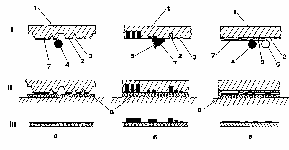 Рисунок 1 – Схема форм високого а, глибокого б та плоского в друку: 1 – вигляд друкарської форми та схема нанесення фарбуючої речовини; II – друкарський процес; 111 – вигляд результатів друку; 1 – друкарська форма, 2 – друкарські елементи, 3 – пробільні елементи, 4 – фарбовий валик, 5– ракельний ніж, 6 – зволожувальний валик, 7– фарба, 8 – папір