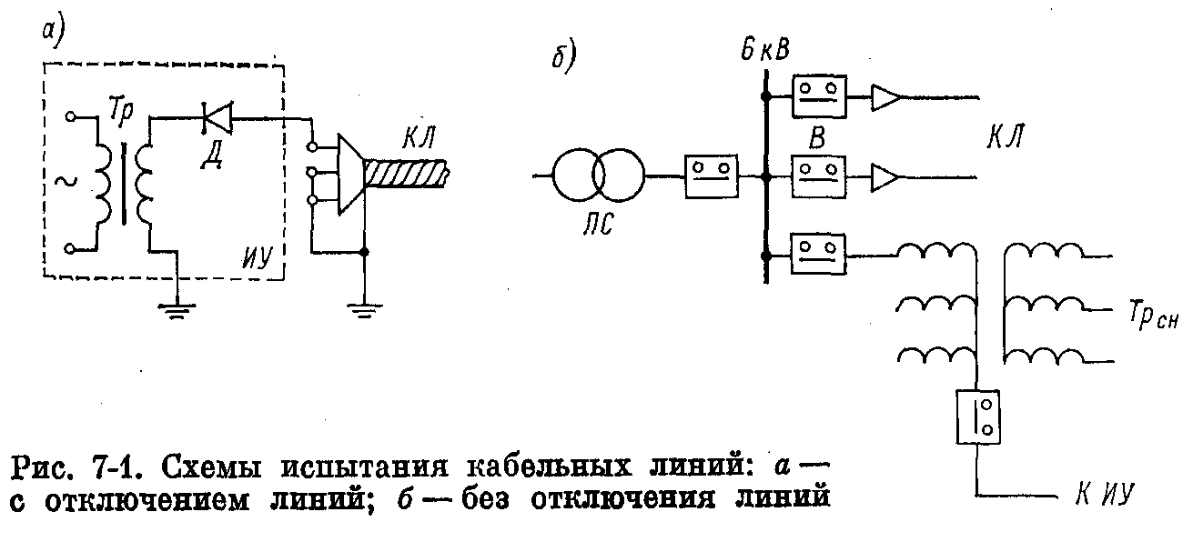 Применение выпрямленного напряжения для испытания КЛ весьма эффективно. Для этих целей применяются транспортабельные испытательные установки ограниченной мощности и габаритов. Последнее определяется тем, что параметры таких установок зависят от тока утечки и изоляции КЛ, в то время как при использовании повышенного переменного напряжения параметры установок определяются емкостью линий, которая для КЛ весьма значительна. При этом выпрямленное напряжение, по сравнению с таким же по величине напряжением, оказывает малое воздействие на неповрежденную изоляцию кабельных линий.