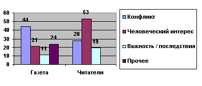 В то время, как газеты смотрят на новость с точки зрения конфликта, читатели заинтересованы в информации, освещающей человеческий интерес. Хотя газеты ценят конфликт больше других подходов – как можно наблюдать в профессиональной практике, читательский интерес требует пересмотра этого критерия качества.
