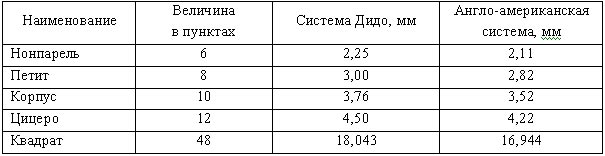 В полиграфии, следовательно, и при оформлении печатных изданий, используются особые единицы измерения – типометрические. Одна из них – система Дидо – распространена в большинстве европейских стран, в том числе в России. Она основана на французском дюйме, существовавшем до введения метрической системы, и была введена в XVIII в.: предложил ее в 1737 г. французский словолитчик П.С. Фурнье, позже, в конце того же столетия, систему усовершенствовал Ф.-А. Дидо, представитель известной семьи парижских типографов, и ее стали называть типометрической системой Дидо. В основе лежит типографский пункт, равный 1/72 французского дюйма, иначе 0,3759 или округленно 0,376 мм (французский дюйм равен 27,1 мм). Для более крупных измерений применяется типографский квадрат, равный 48 пунктам (18 мм). Промежуточной единицей измерения является цицеро, равное ¼ квадрата или 12 пунктам (4,5 мм).