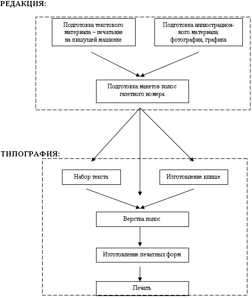 Представим схематично распределение технологических процессов между редакцией и типографией. При традиционной «горячей» технологии схема такова: