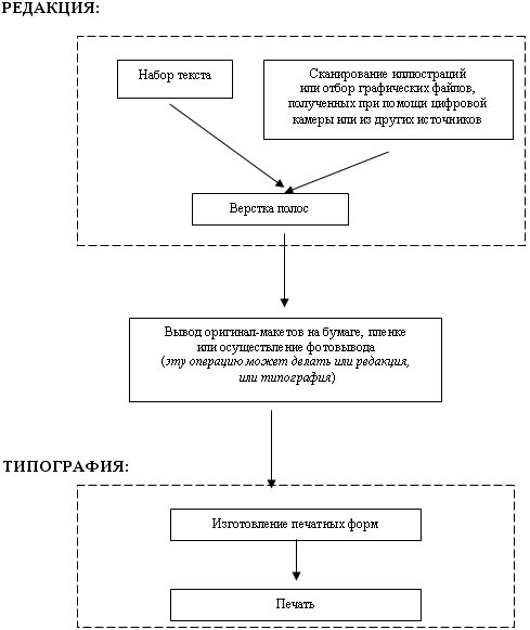 Ввод текста, его редактирование, сканирование и обработка иллюстраций, макетирование и верстка, изготовление оригинал-макетов или фотоформ для типографии – все это компьютерная полиграфия, перешедшая непосредственно в редакцию и позволившая включить в технологические процессы всех или почти всех сотрудников редакции.