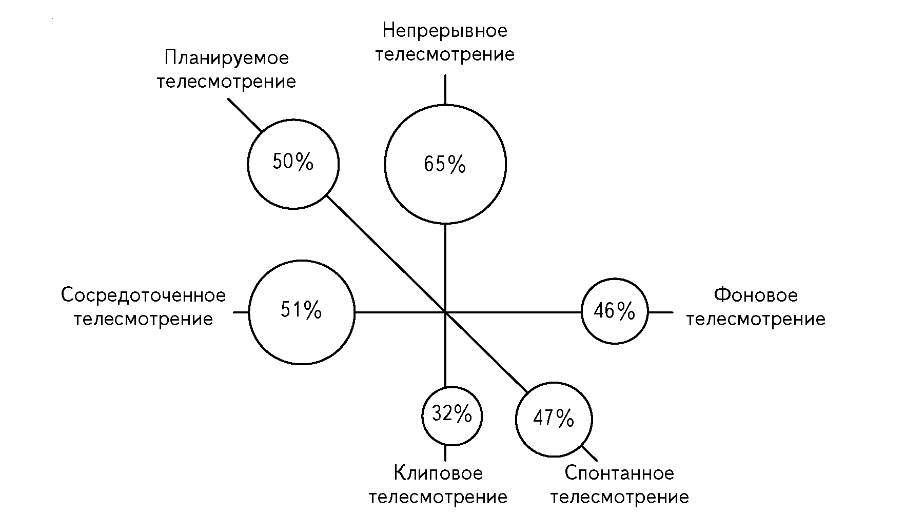 Помимо обозначенных выше тенденций изменения медиапространства, влияющих на популярность телевидения, в определенной степени изменяется и характер "взаимоотношений" телезрителя и телевизора. Данный процесс обусловлен, на наш взгляд, двумя факторами: во-первых, изменяется роль телевидения в жизни человека; во-вторых, изменяется социально-демографическая структура телевизионной аудитории (притом, что существуют особенности телесмотрения, характерные для отдельных групп населения это оказывает влияние на показатели аудитории в целом). Различия в характере телесмотрения были описаны П. Ковалевым в 2002 г. В своей статье "Привычки телесмотрения, или Как мы смотрим телевизор" П. Ковалев исследует основные типы телесмотрения и их соотношение с социально-демографическими параметрами аудитории. Отмечая изменение роли телевидения в жизни населения, автор статьи выделяет тот факт, что эти изменения формируют новые типы телесмотрения. В частности, по мере того, как телевидение перестает быть основным окном в мир для зрителя, очагом культуры и развлечений, все большее развитие получает фоновое телесмотрение. Фоновое телесмотрение — процесс потребления телевизионного контента, сопровождаемый еще какой-либо деятельность. То есть внимание респондента полностью не уделено просмотру ТВ. Ранее фоновый характер потребления являлся характерной чертой другого медиа — радио. Фоновое телесмотрение является противоположностью сосредоточенного смотрения. В то время, как раньше в процессе телепотребления преобладало сосредоточенное телесмотрение, в последние годы процесс просмотра телевизора все чаще совмещается с другими делами. По результатам проведенного исследования, лишь 51% респондентов предпочитает смотреть телевизор не отвлекаясь, отложив все дела. Фоновое телесмотрение в наибольшей степени распространено среди аудитории в возрасте от 25 до 54 лет. Кроме описанных выше моделей телесмотрения, автором выделяются еще 4 типа просмотра телевизора: непрерывное и клиповое; планируемое и спонтанное. Непрерывным телесмотрением называется процесс ме-диапотребления, при котором зритель смотрит программу от начала и до конца. Альтернативой данной модели телесмотрения является клиповое телесмотрения, при котором телезритель постоянно переключает каналы, формируя собственный видео ряд из множества отрывков транслируемых программ. В случае, когда телезритель планирует свои дела и телепросмотр таким образом, чтобы иметь возможность увидеть интересующее его эфирное событие, имеет место планируемое телесмотрение. Просмотр телевизора в свободное время, не зависимо от контента и выбора программы из числа представленных, являет собой спонтанное телесмотрение.