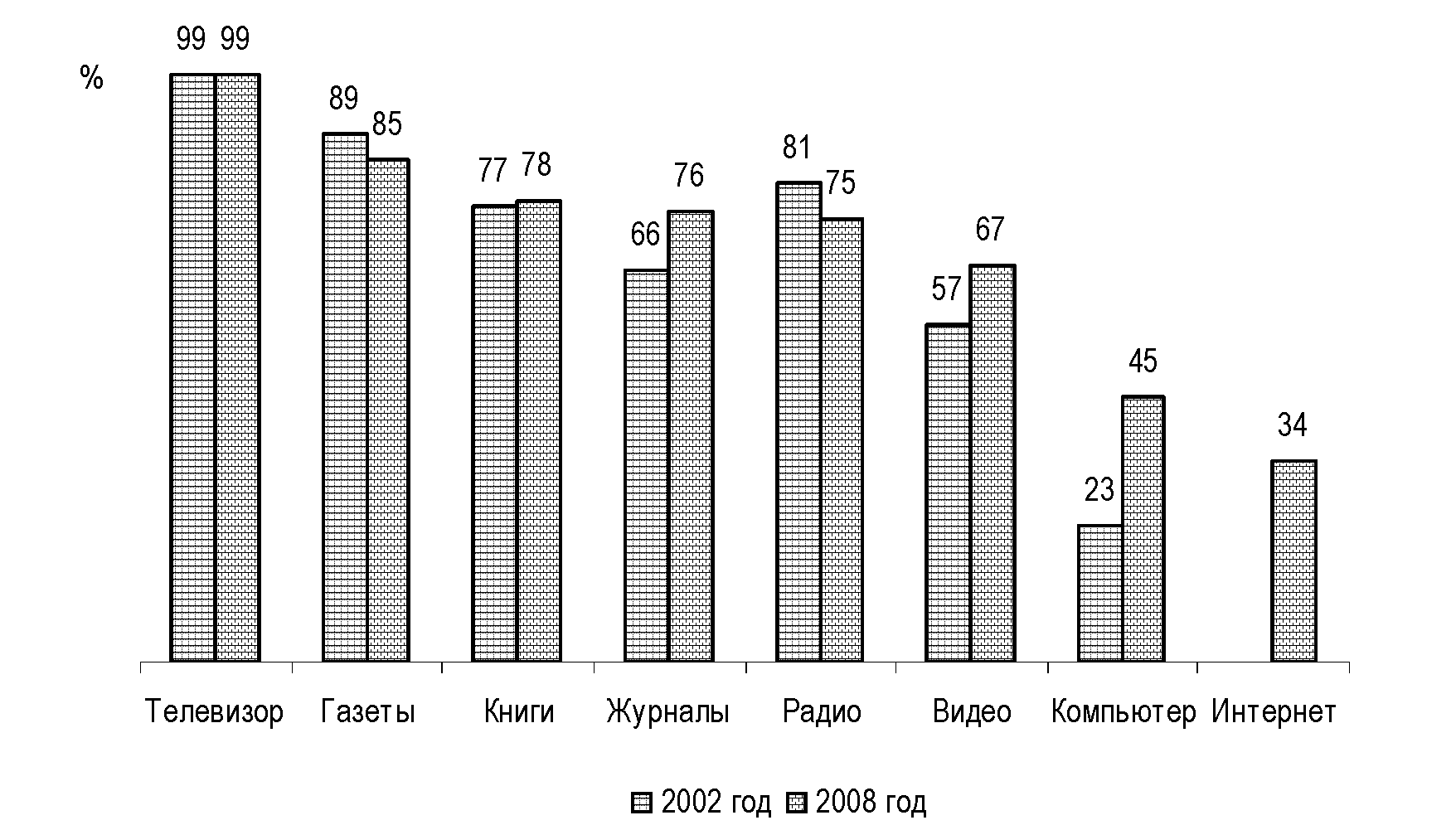 Развитие новых технологий неизменно сопровождается изменением медийного пространства, в котором существует человек. Появление телевидения существенно снизило популярность печатных изданий и книг. На сегодняшний день мы являемся свидетелями другого примера изменения медиапространства. Невозможно отрицать тот факт, что развитие новых технологий, в частности всемирной сети Интернет, способствует перераспределению медийного потребления человека. Диверсификация медиа-предложения влечет за собой перераспределение времени, уделяемого на те или иные информационные носители. Неизменным остается интерес телезрителей к телевидению (рис. 1), в период с 2002 по 2008 г. доля населения, обращавшихся к телевизору, остается постоянной и наибольшей в сравнении с другими медиа. В то же время существенно сократилась доля населения, читающая газеты и слушающая радио. В ходе сопоставления этих процессов с увеличением доли населения, пользующейся компьютером и сетью Интернет, рождается гипотеза о том, что Интернет и компьютер заменяют в жизни общества газеты и радио, как источники информации и способы организации досуга. Следует отметить неизменный интерес населения нашей страны к чтению книг, которое не сокращается на фоне увеличения популярности Интернета, которому, как и ранее телевидению, не удается вытеснить книги из жизни людей.