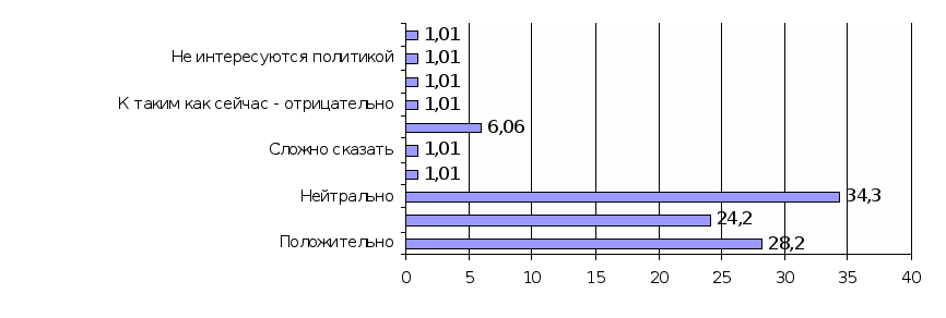 К переменам в политической жизни России большинство опрошенных (34,3% или 102 человека) относятся нейтрально. Положительно – 28,2% (84 человека). Отрицательно – 24,2% (72 человека). Многие выражали собственное мнение. Ответили что никак не относятся 6,06% (18 человек), 1,01% (по 3 человека) отвечали, что: «не очень хорошо», «сложно сказать», «к таким переменам как сейчас – отрицательно», «затрудняюсь ответить», «не интересуюсь политикой», «не очень хорошо, но не сказать, что резко отрицательно». 0,33% (по одному человеку) отвечали: «все равно, нас никто не спрашивал (о согласии)», «пока не знаю как буду относиться, не вижу результатов».