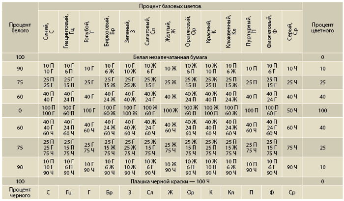 Как видно в табл. 4, сумма относительного содержания красок на оттиске не превышает 200%. Для того чтобы включить в таблицу более насыщенные и зачерненные тона, можно поступить следующим образом: взять только верхнюю часть табл. 4 (разбеленные тона) со строкой базовых цветов и задать постоянное значение черного в столбце «% черного» (табл. 5). Такая шкала цветового охвата будет включать одиннадцать таблиц, аналогичных табл. 5 и отличающихся только уровнем черного (при шаге уровня черного в 10%). Таблица с уровнем черного, равным нулю, будет соответствовать таблице разбеленных оттенков базовых цветов. В результате мы получим 12 базовых полей, 120 разбеленных, 10 серых и 1200 зачерненных полей, или в сумме — 1342 оттенков.