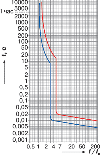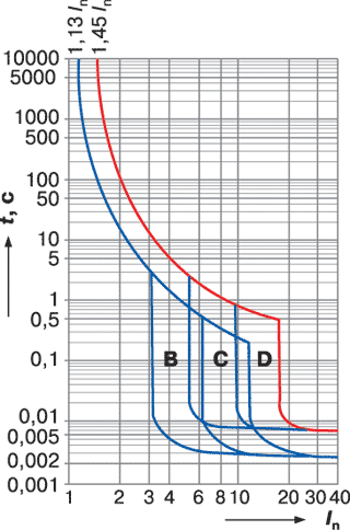 Важную роль играет время срабатывания электромагнитных расцепителей автомата при КЗ. ГОСТ Р 5034599 [3], а также аналогичные зарубежные документы, к сожалению, содержат лишь требование о том, что время действия автоматических выключателей в начальной зоне отсечки («время мгновенного расцепления») должно быть менее 0,1 с.